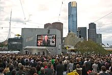 A key part of the plaza design is its large and fixed public screen, which has been used to broadcast major sporting events such as the AFL Grand Final and still continues to do so. During the 2006 FIFA World Cup, thousands of football fans assembled to watch matches on the screen. The original screen was later enlarged.