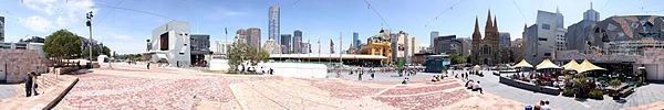 The public space covers an area of 3.2 hectares and is centred around two major public spaces: open squares (St. Paul's Court and The Square) and one covered (The Atrium), built on top of a concrete deck above busy railway lines. It is located at intersection between Flinders Street and Swanston Street/St Kilda Road in Melbourne's Central Business District, and is adjacent to Melbourne's busiest railway station, Flinders Street Station.