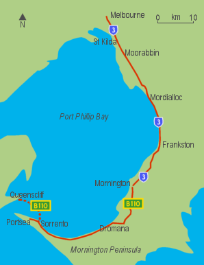 Nepean Highway runs south from the centre of Melbourne to Portsea, along the eastern shore of Port Phillip. It is the primary road route to central Melbourne from Melbourne's southern suburbs.